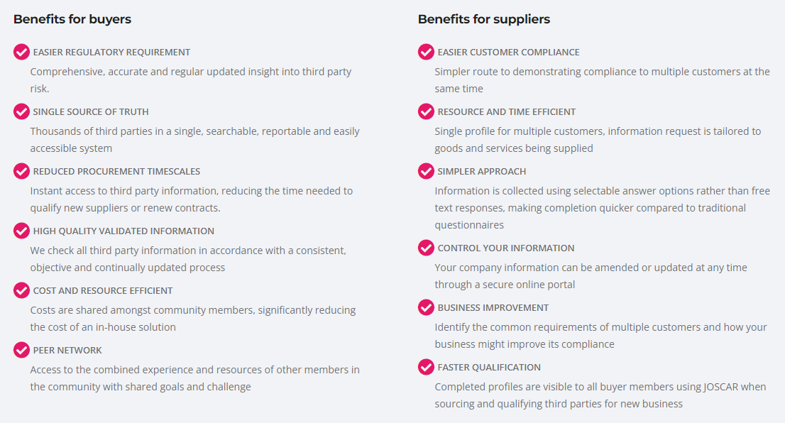 By reducing duplication and having one source of validated data available to all buyers, JOSCAR reduces the compliance workload for both suppliers and buyers, alike.